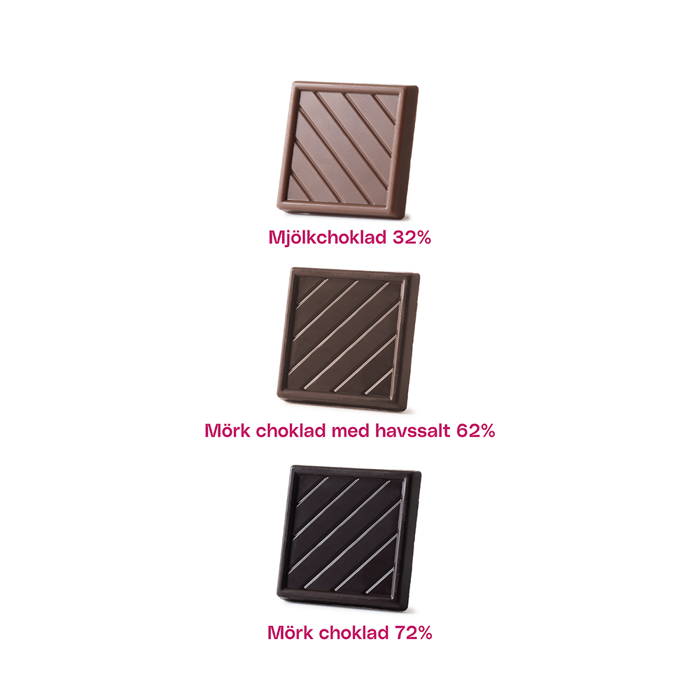"Chokladkvadrater 5g Standard Beställ chokladbitar med egen logotyp och design från endast 500 st. Chokladkvadrater, napolitaner, 5 g-bitar eller chokladfyrkanter – kärt barn, eller i det här fallet choklad, har många namn. Våra små chokladbitar är en välkommen gäst vid varje kaffebjudning. Perfekta att bjuda på vid kaffepausen, ställa fram i receptionen eller dela ut på event. Välj mellan tre smaker: · Mjölkchoklad 32% – krämig och len · Mörk choklad 70% – fyllig och intensiv, även vegansk · Mörk choklad med havssalt 60% – balanserad sötma och sälta Varje bit väger 5 g och trycks med er egen logotyp eller design. Minsta beställning är endast 500 bitar – en liten men effektfull profilprodukt som sprider ert varumärke och gör ett smakfullt intryck. PS: Du kan även köpa till en ask för 29 SEK/st, som rymmer 75 bitar."