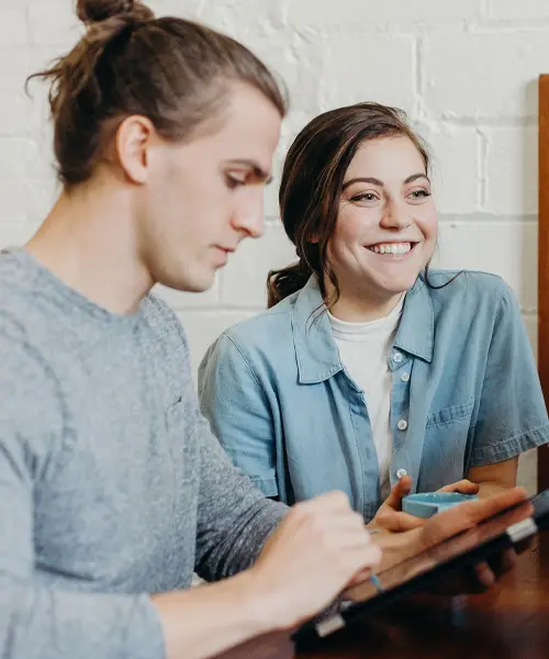 Två modeller: En kvinna i en svart keps och en svart T-shirt med "Voky" tryckt på båda plaggen. En man i en hoodie med "Voky" tryckt på bröstet.